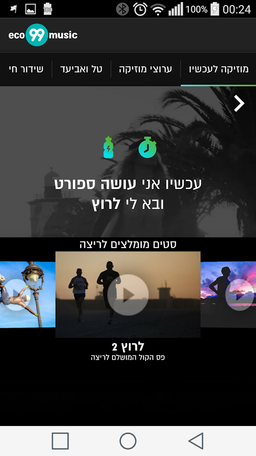 בחרו את האופציה לרוץ, ושם תמצאו 5 פלייליסטים שונים. כמובן שאין סיבה אמיתית לבחור דווקא בהם… יש פלייליסטים נהדרים שיכולים להתאים לריצה גם בקטגוריות האחרות, שחלקן מסודרות לפי תקופות (אייטיז, ניינטיז וכדומה), לפי זמרים, סגנונות מוזיקליים ועוד שלל ערוצים לבחירה.